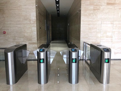 考慮到辦公樓進(jìn)出人員的復(fù)雜性,在進(jìn)出大樓的大廳處設(shè)立智能識(shí)別通道閘,閘機(jī)集成了訪客系統(tǒng)、門禁系統(tǒng)個(gè)和員工考勤系統(tǒng)等,采用指紋識(shí)別+快速通道閘方案,同時(shí)保留了智能卡認(rèn)證方式,自動(dòng)識(shí)別并記錄通行人員身份信息,形成一個(gè)一體化的管理系統(tǒng)。