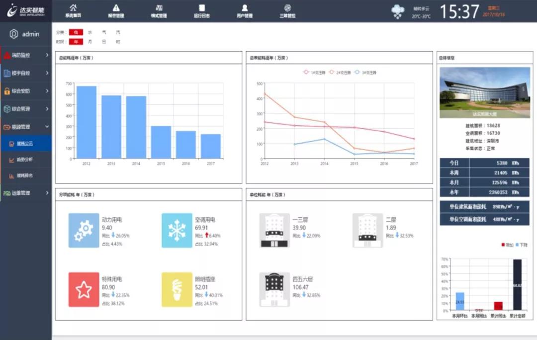 考慮到單位多、人員復(fù)雜、服務(wù)事項(xiàng)繁雜等特點(diǎn),株洲市民中心采用了達(dá)實(shí)IBMS綜合監(jiān)控管理平臺(tái)作為后勤支持,將數(shù)據(jù)匯集到管理平臺(tái)形成集中管理。達(dá)實(shí)基于智能建筑管理平臺(tái)集成了:視頻監(jiān)控系統(tǒng)、設(shè)備監(jiān)控系統(tǒng)、門禁管理系統(tǒng)、停車場(chǎng)管理系統(tǒng)、能源管理系統(tǒng)以及梯控系統(tǒng)。結(jié)合互聯(lián)網(wǎng)、物聯(lián)網(wǎng)、云計(jì)算、大數(shù)據(jù)、人工智能等最新技術(shù),將不同功能的建筑智能化子系統(tǒng)及相關(guān)設(shè)備進(jìn)行綜合管控,打通信息共享渠道,實(shí)現(xiàn)智慧建筑內(nèi)人工環(huán)境的最舒適調(diào)節(jié),機(jī)電設(shè)備的節(jié)能最優(yōu)化控制以及物業(yè)管理人員的決策輔助等功能。