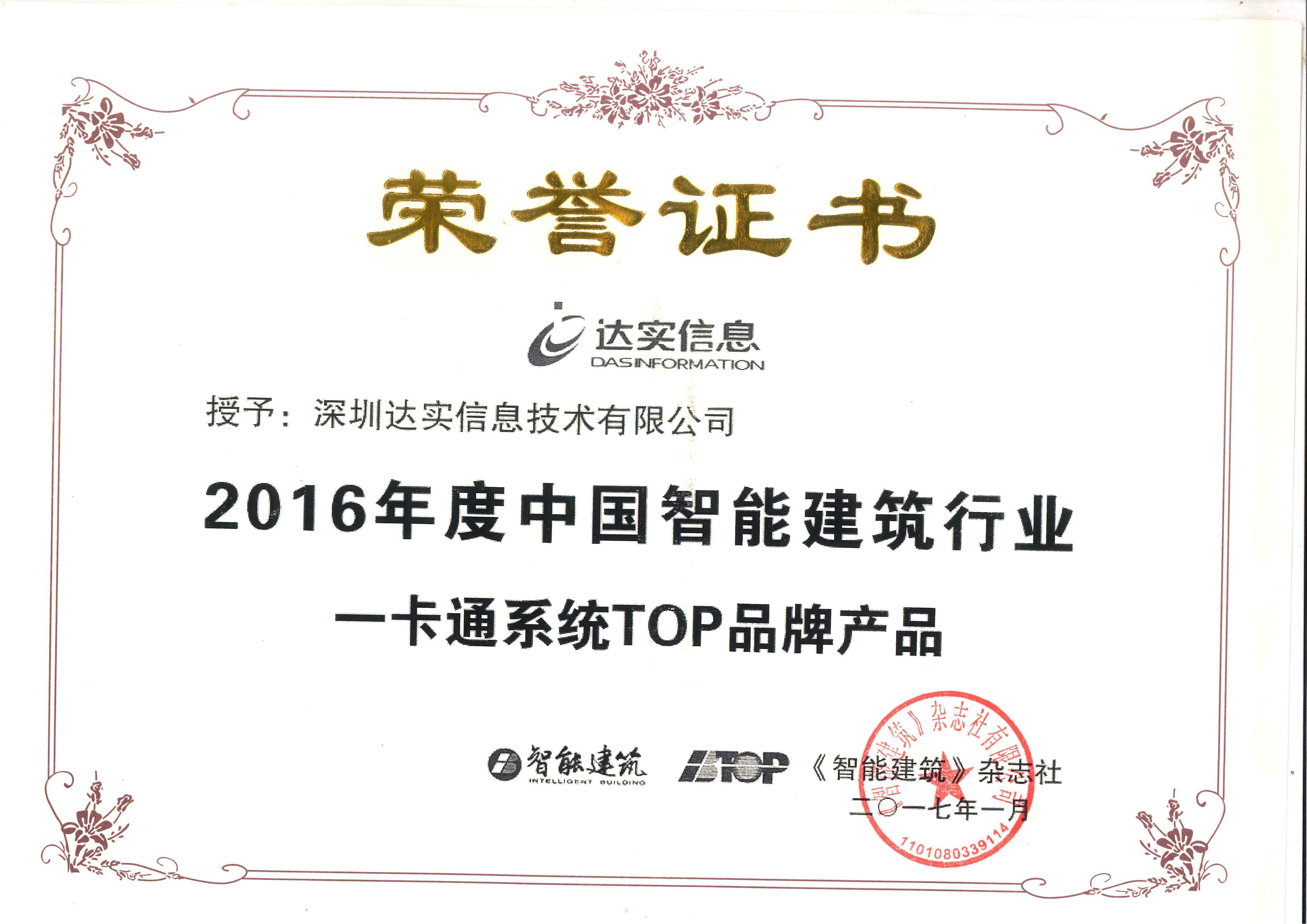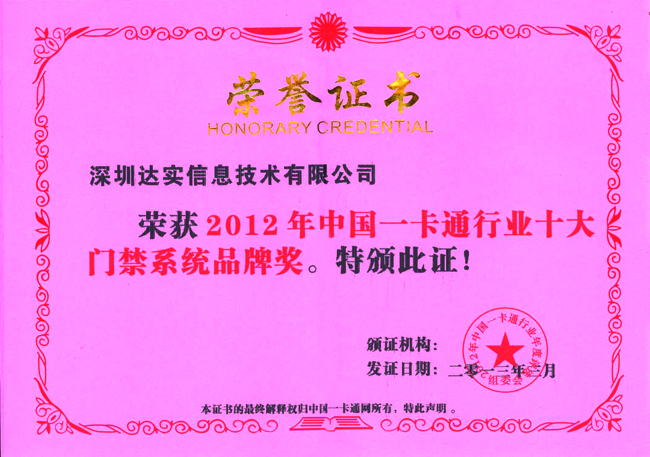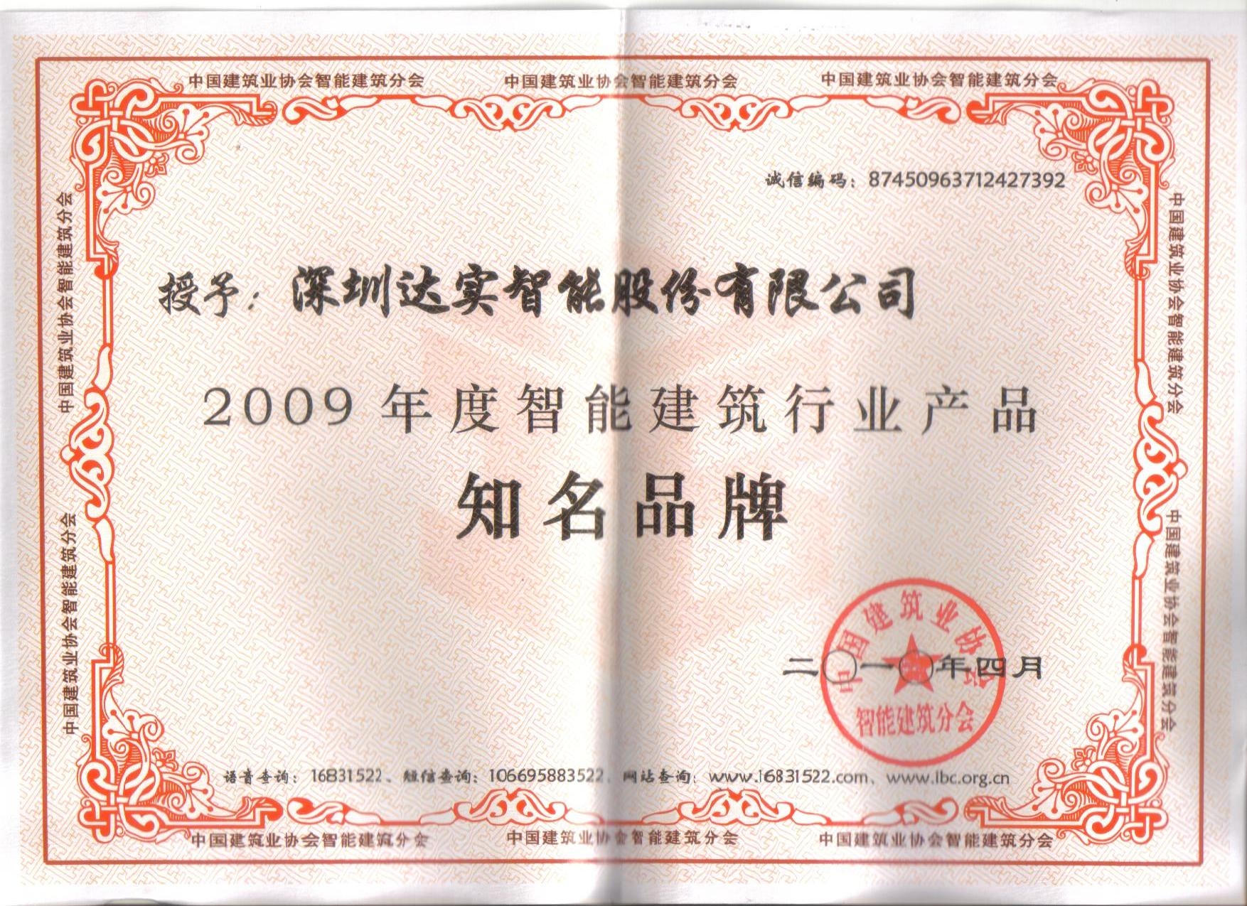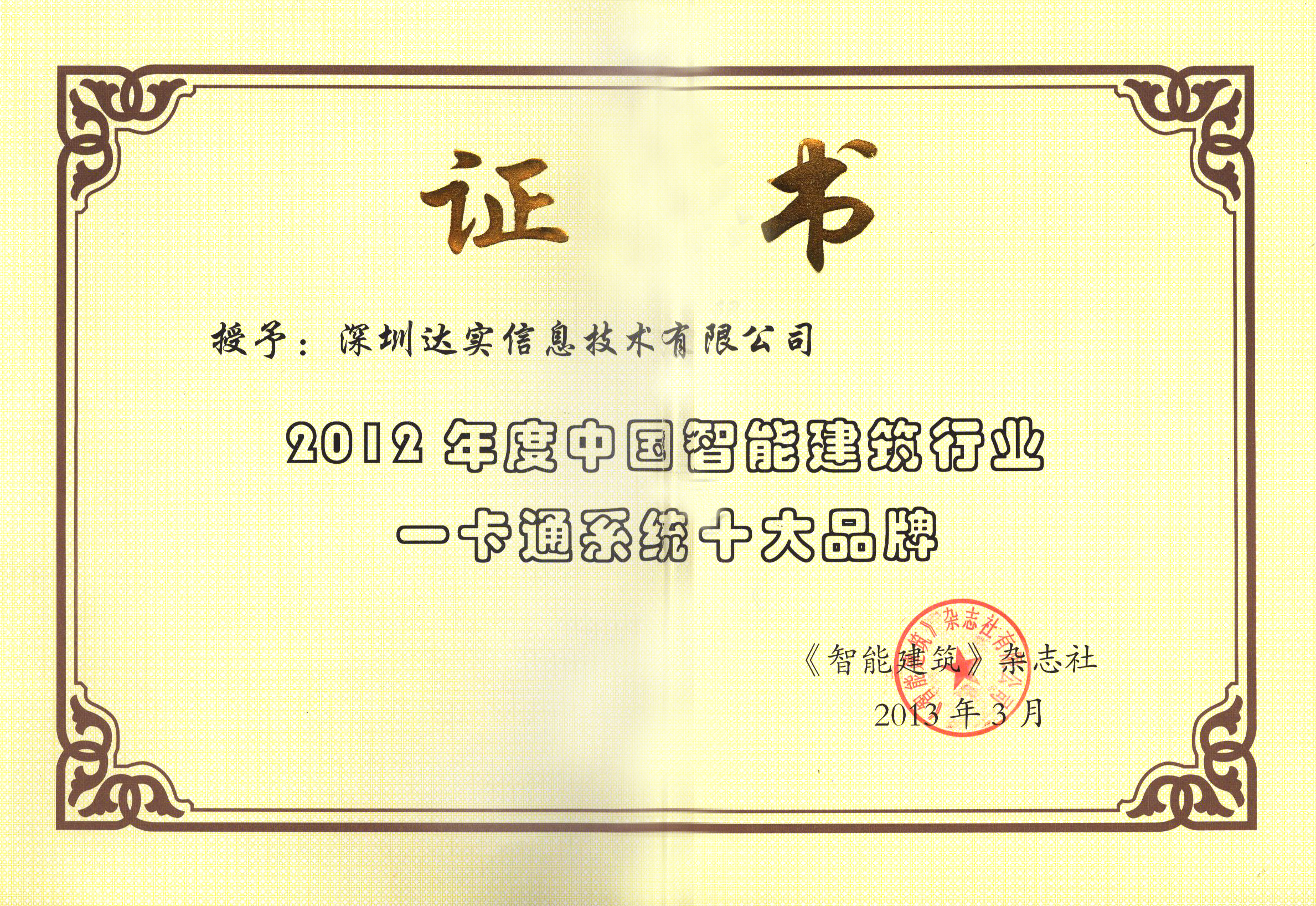 2012年度中國智能建筑行業(yè)一卡通系統(tǒng)十大品牌證書