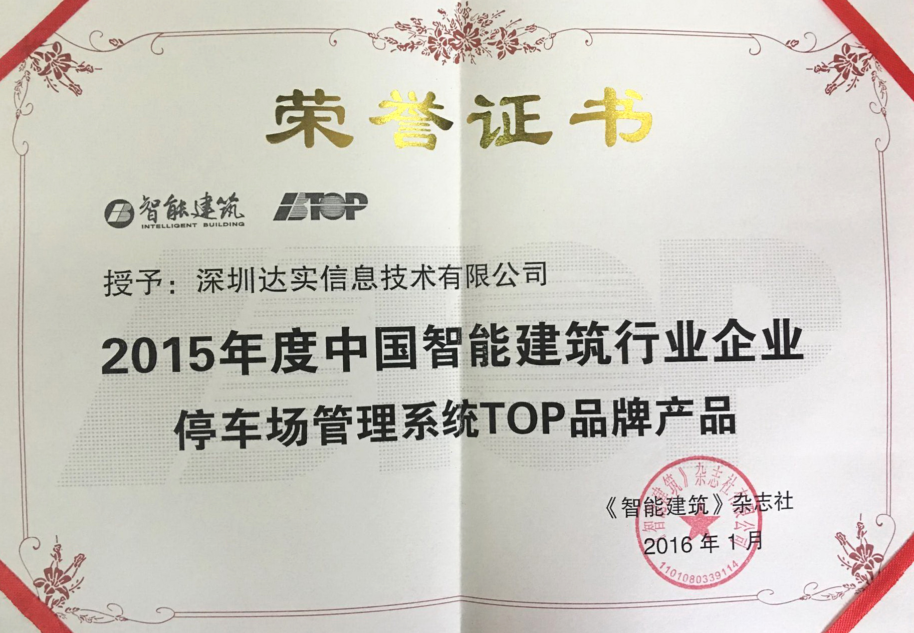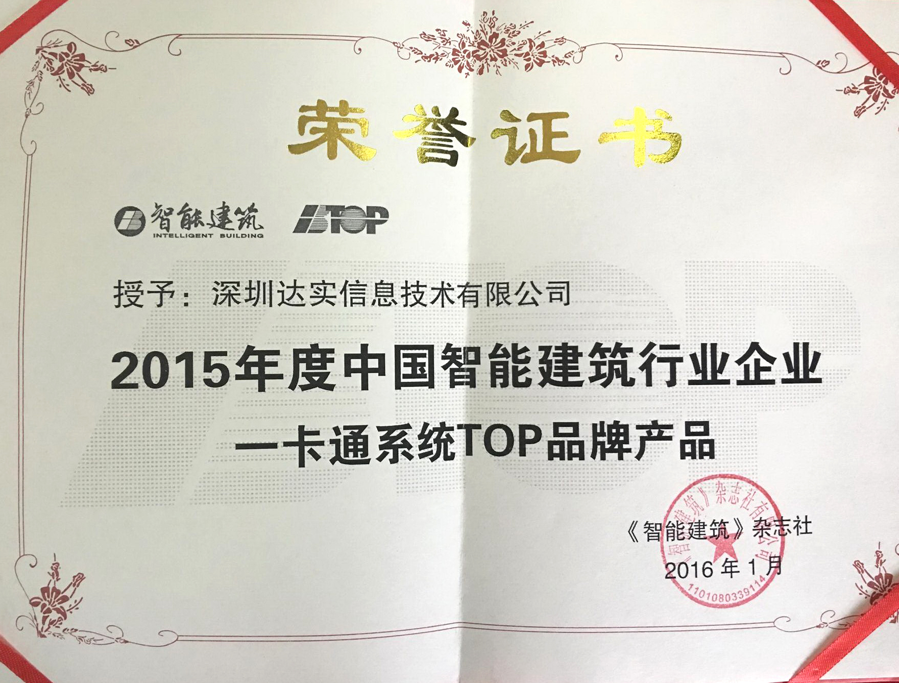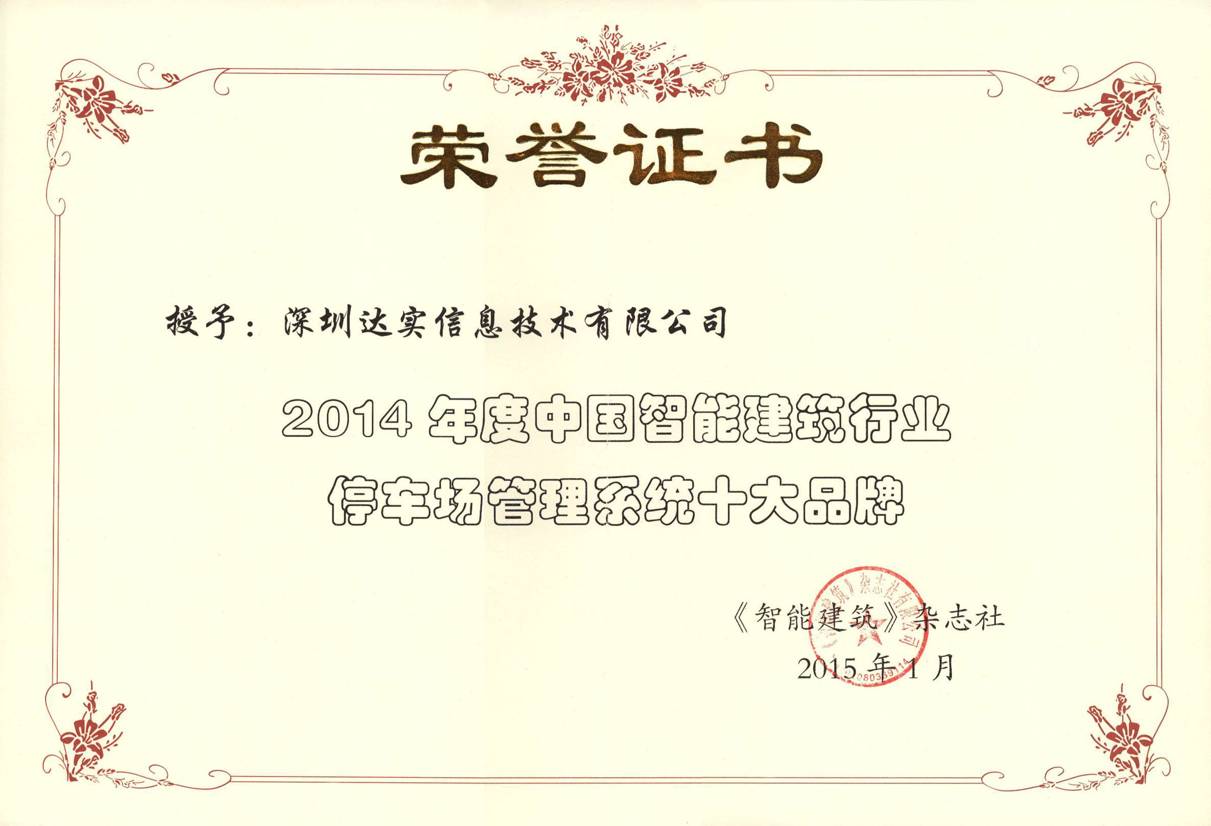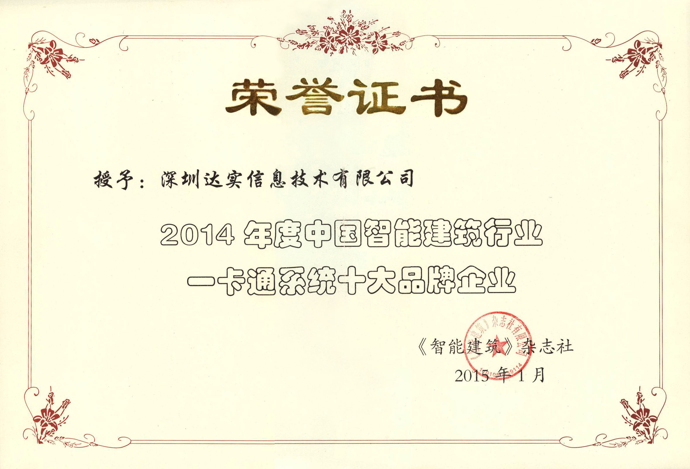 2012年度中國智能建筑行業(yè)一卡通系統(tǒng)十大品牌證書