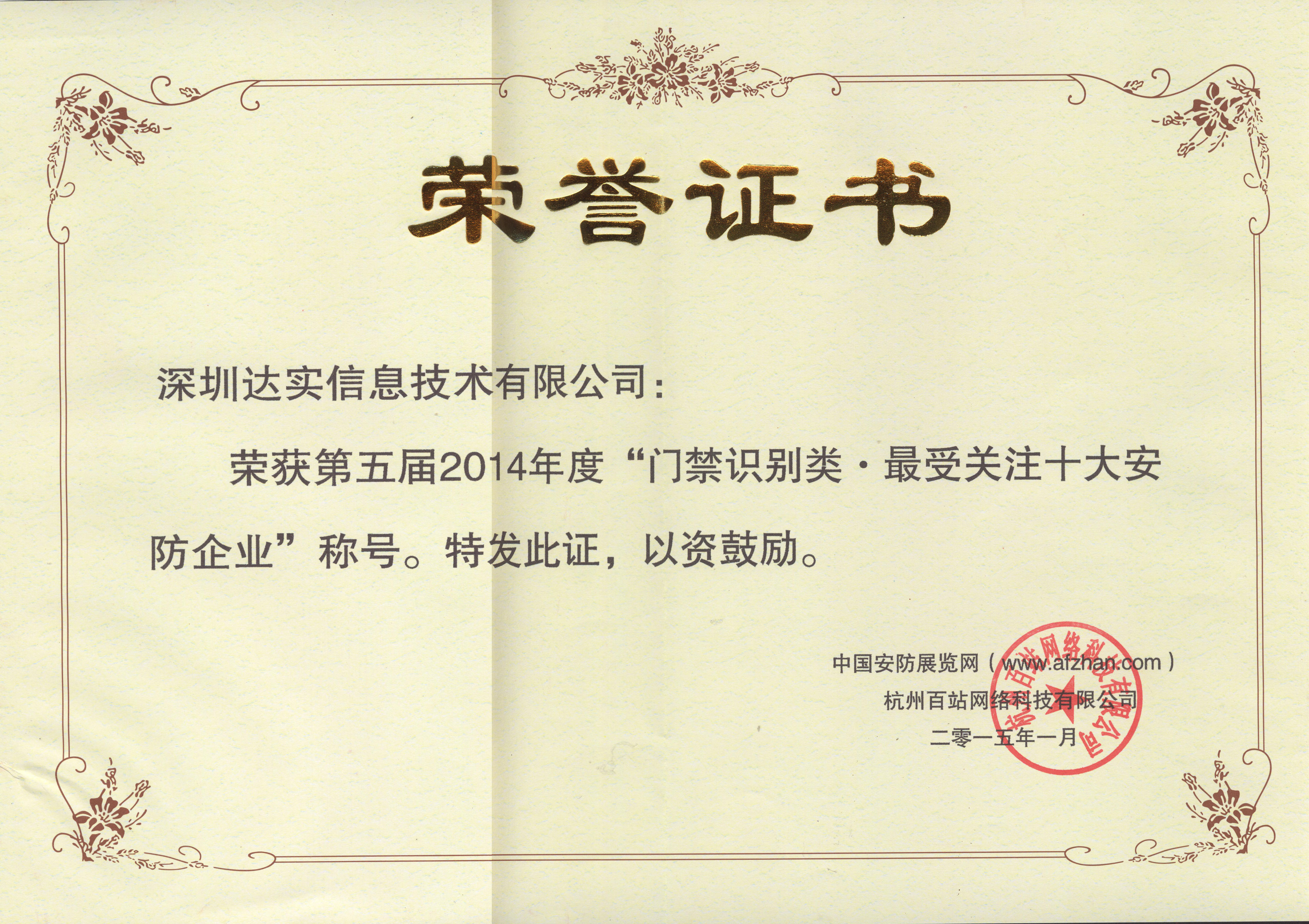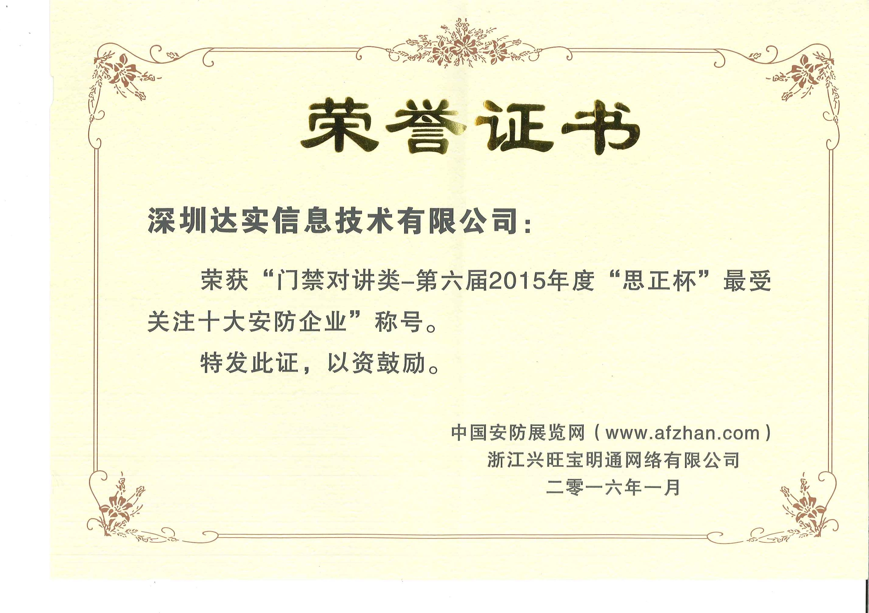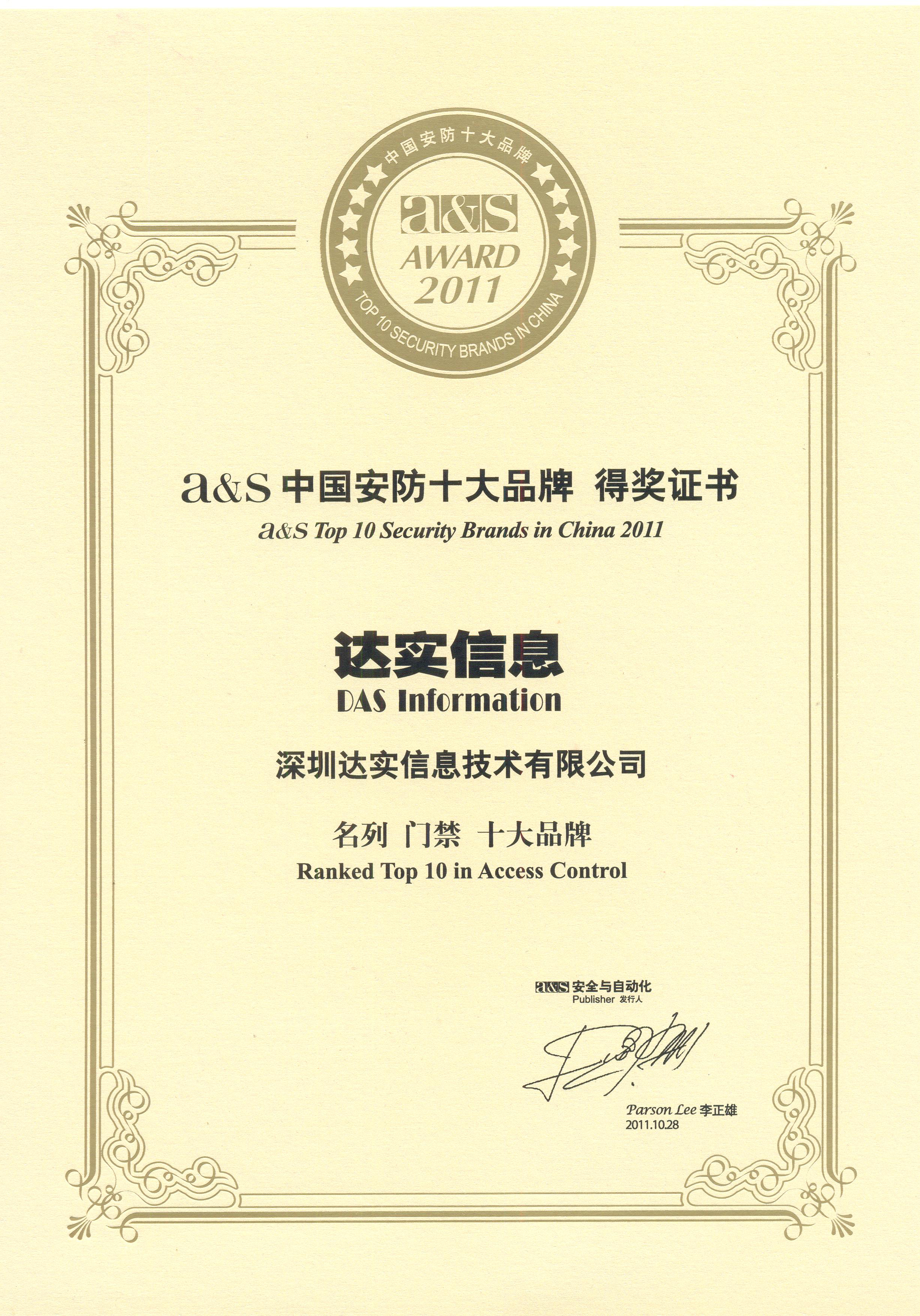 2011中國安防門禁十大品牌證書