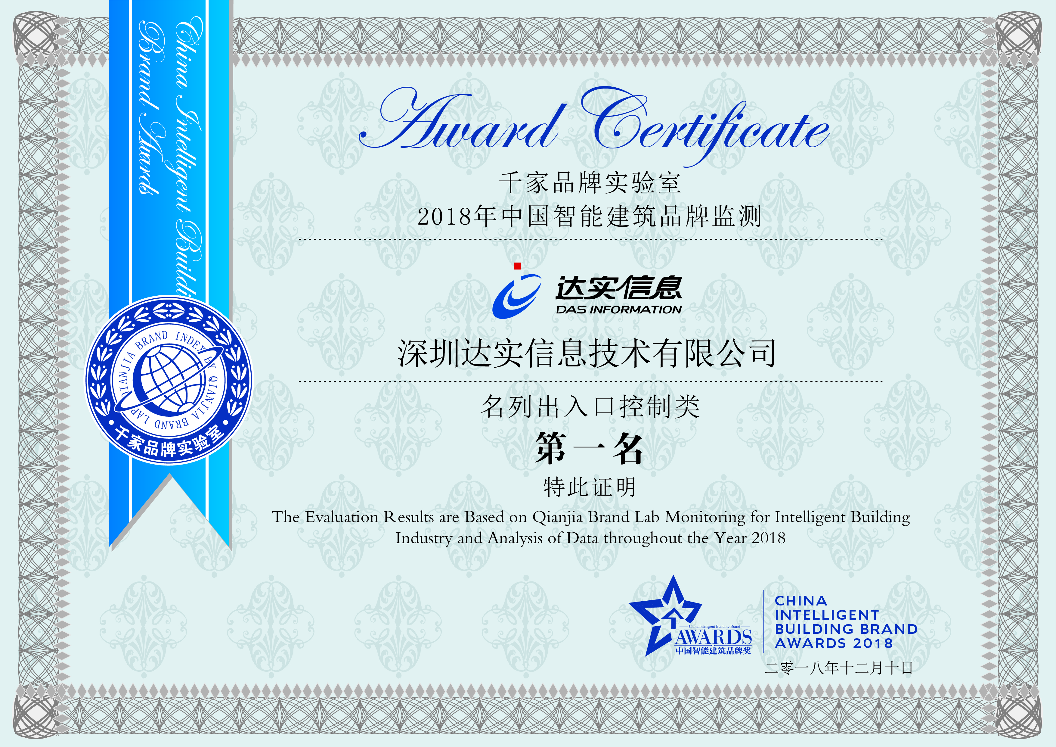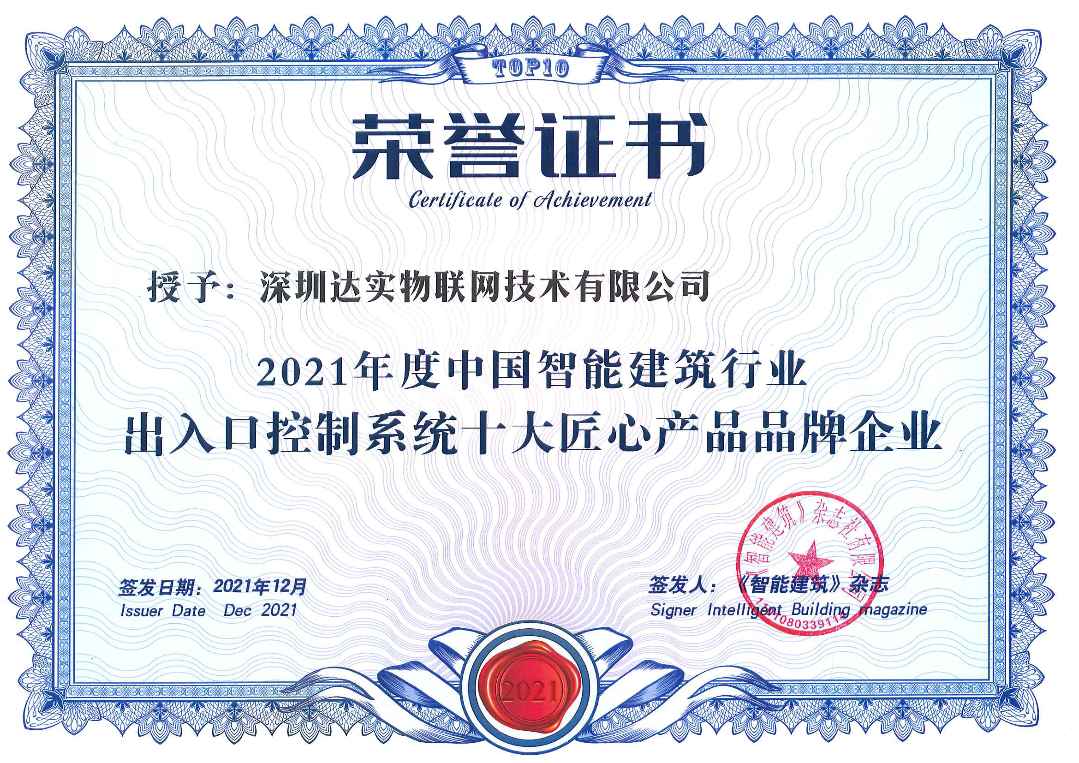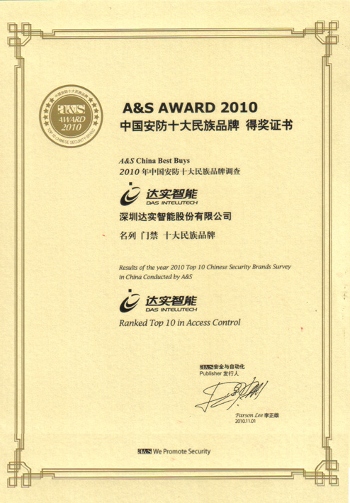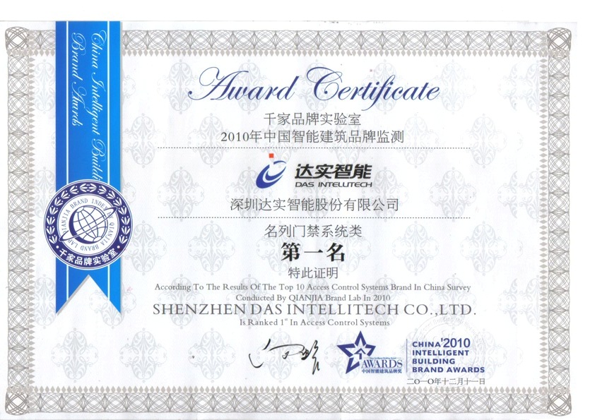 2010中國智能建筑品牌獎(門禁系統(tǒng)類第一名)