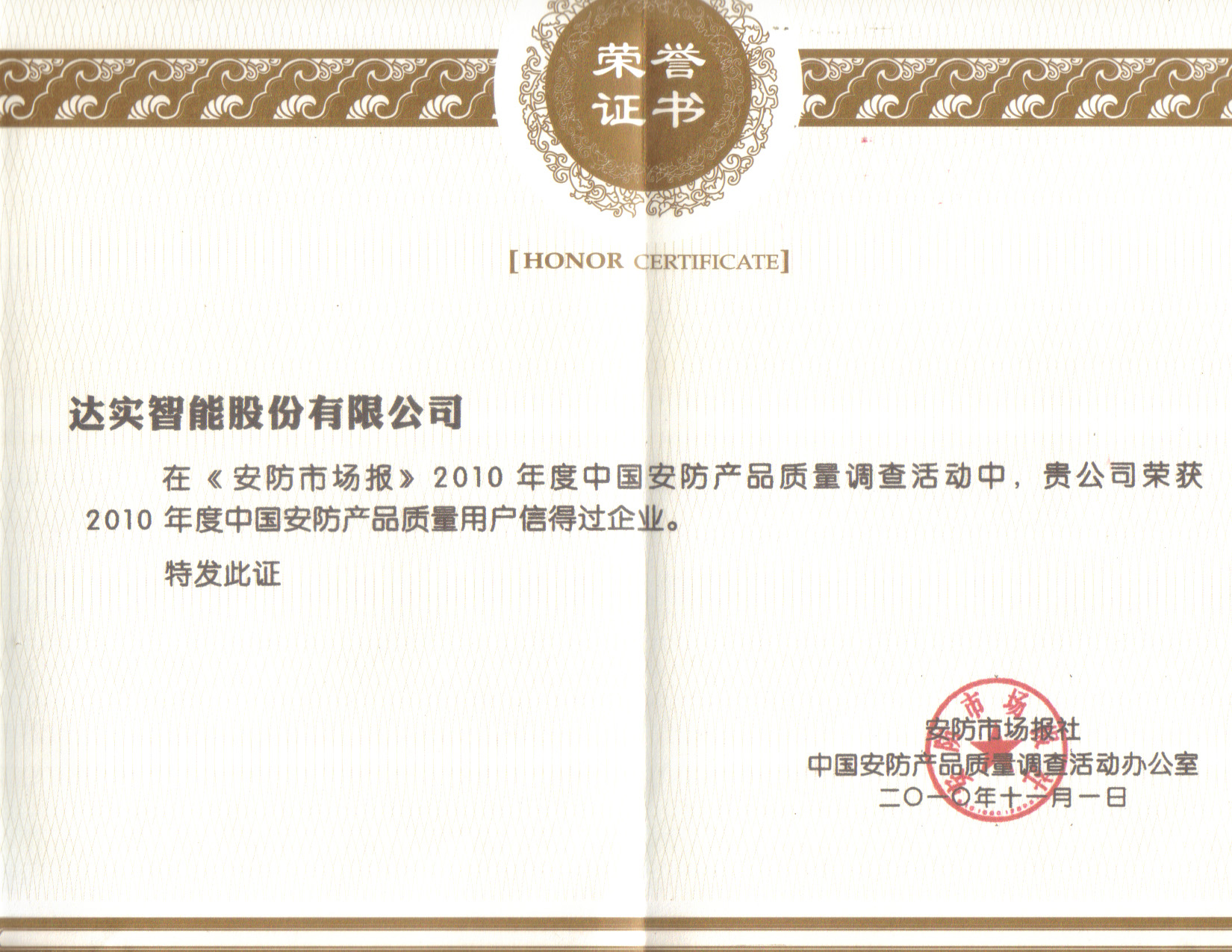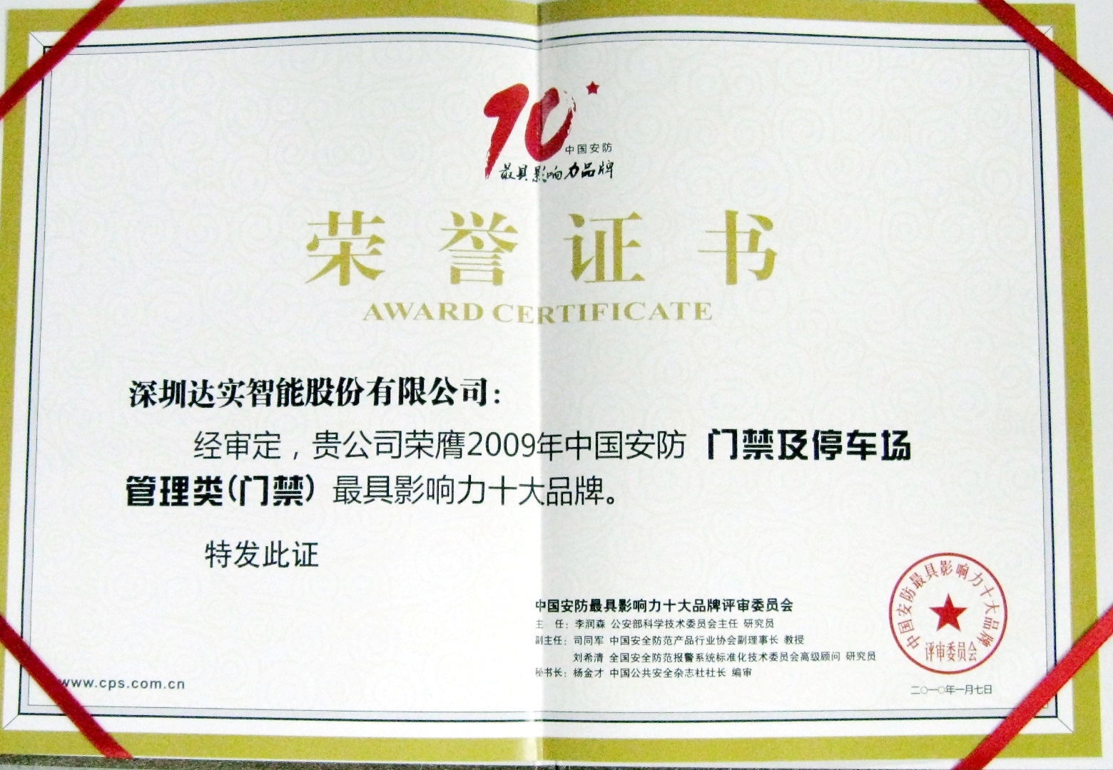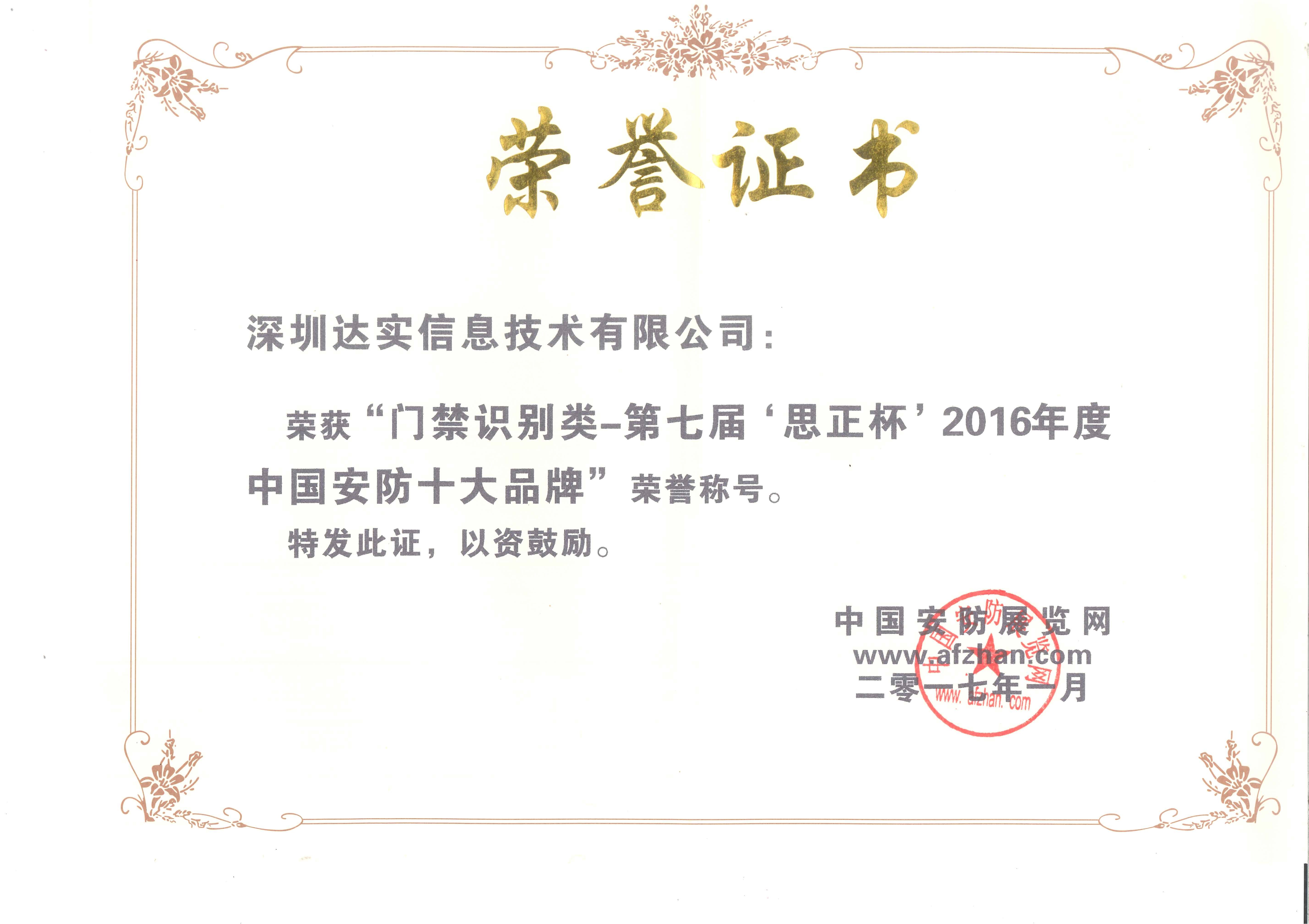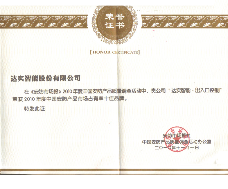 2010中國安防門禁十大民族品牌證書