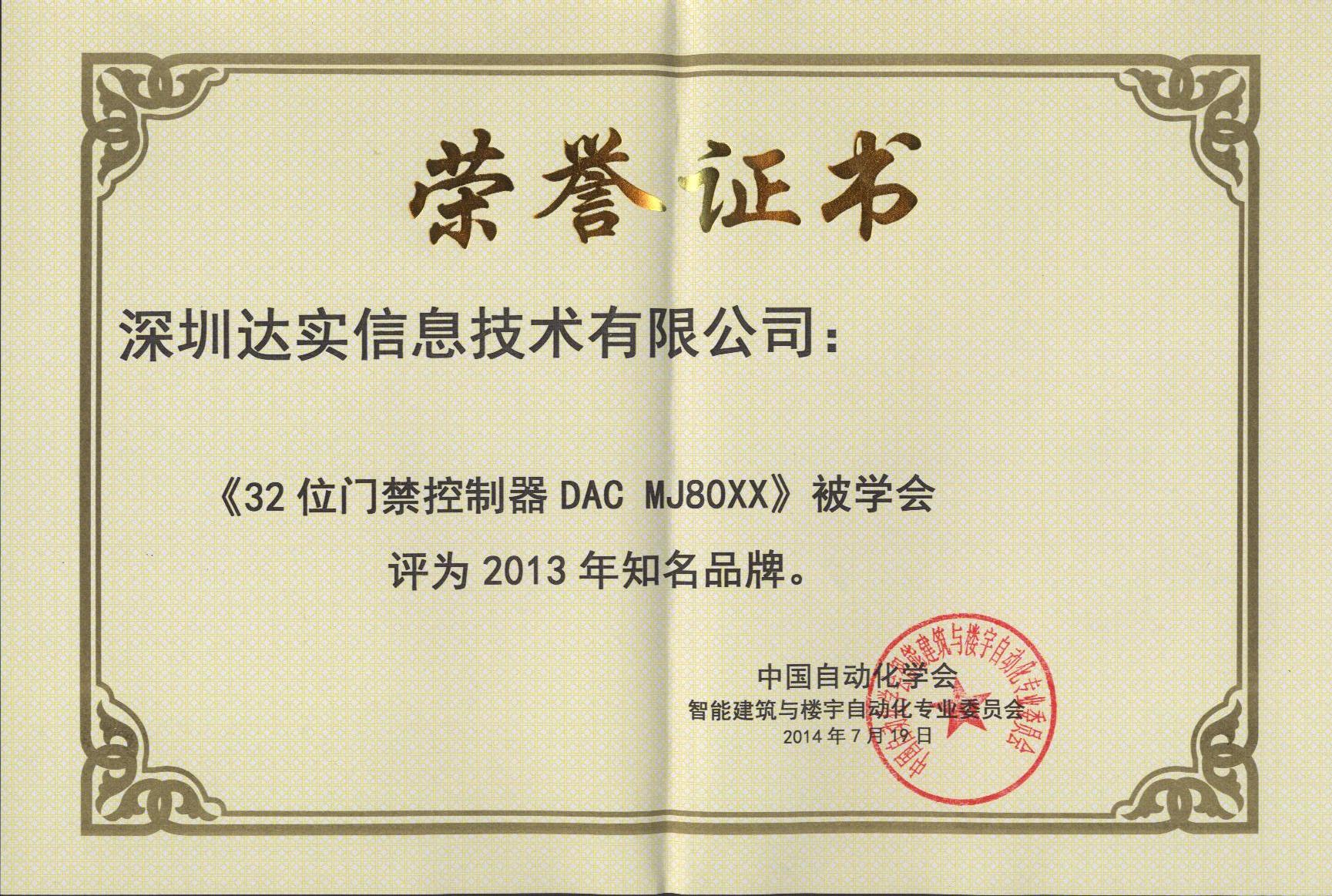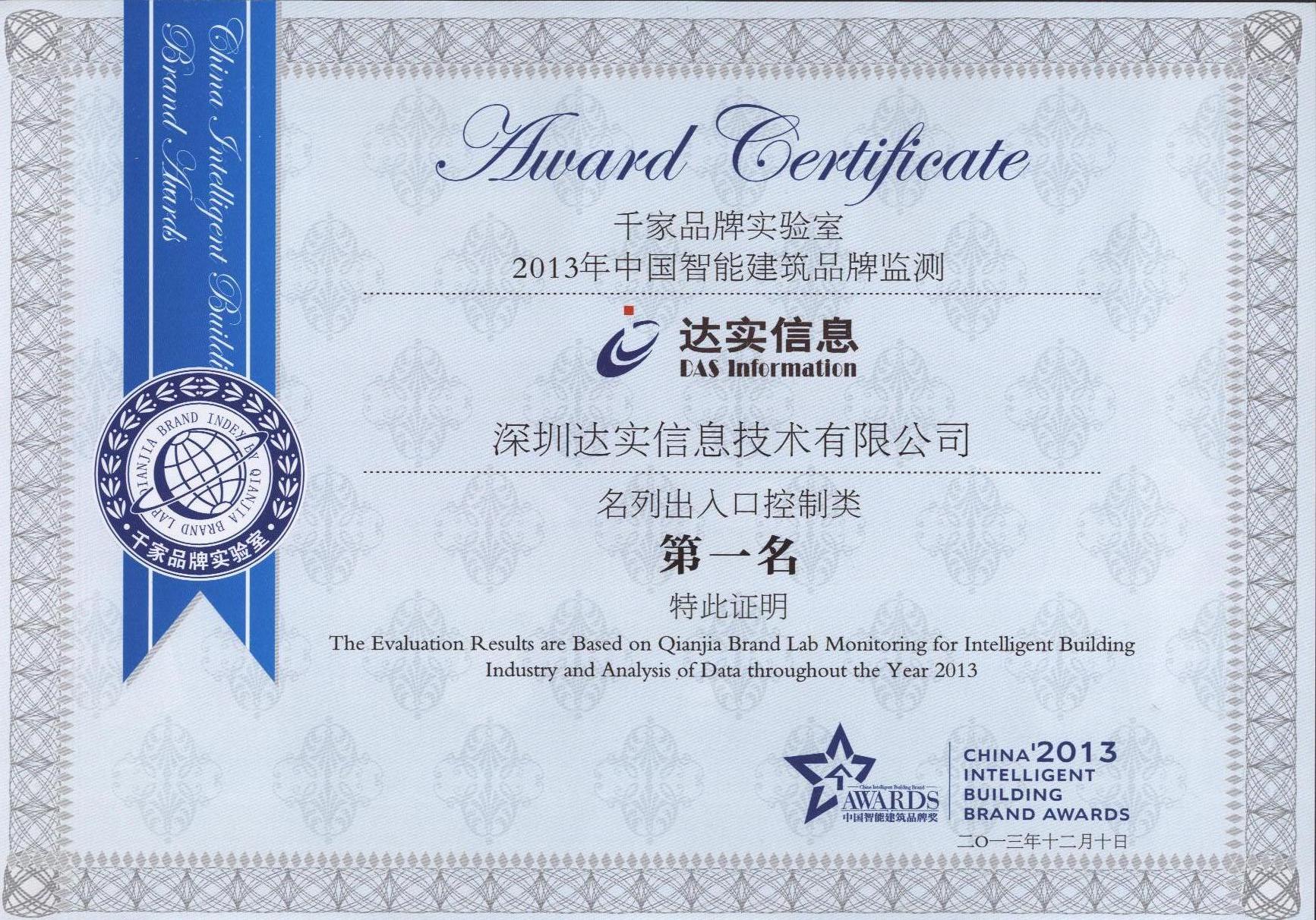 2013年十大出入口控制品牌獎(第一名)