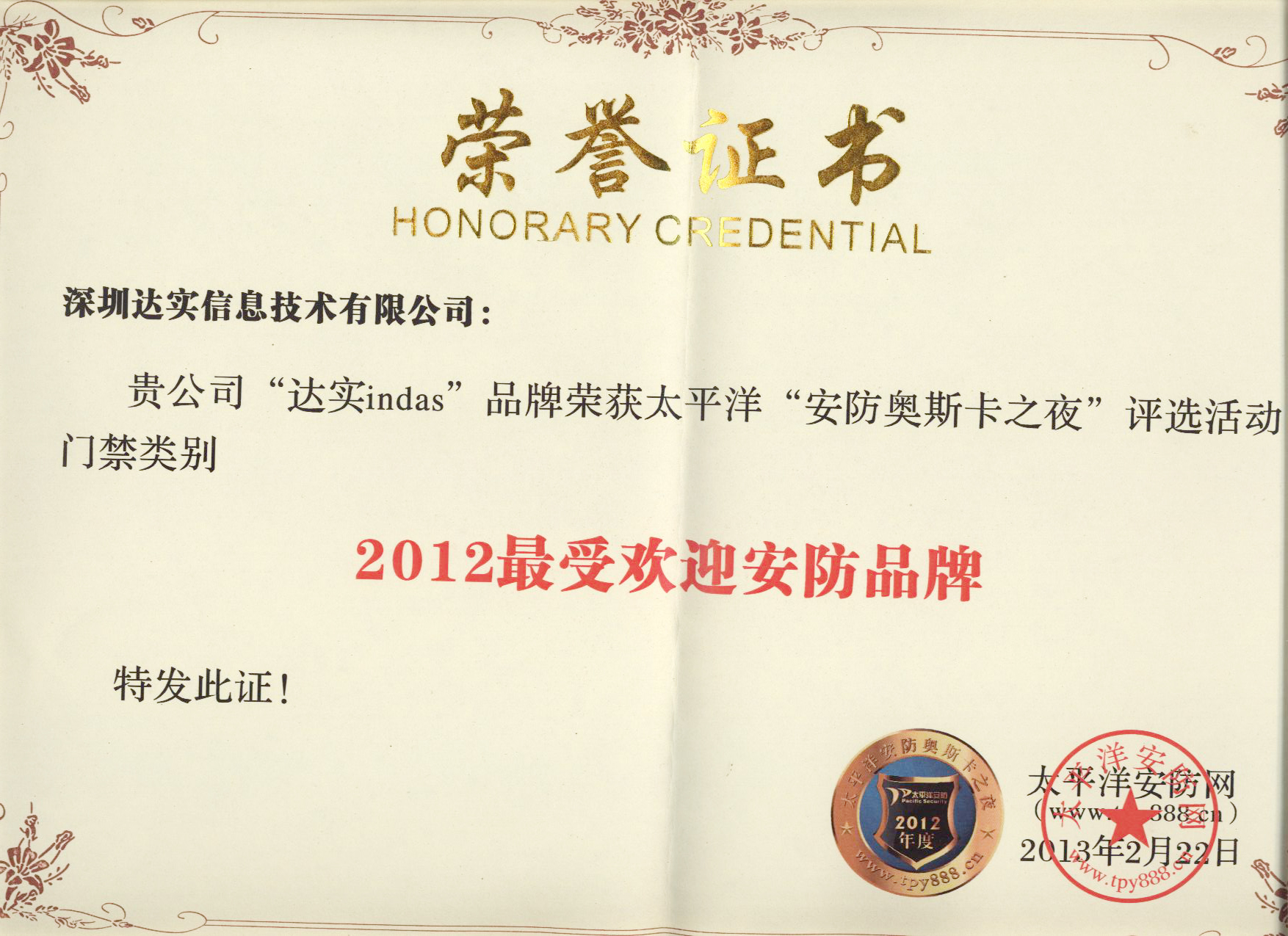 2012中國一卡通行業(yè)十大門禁系統(tǒng)品牌獎