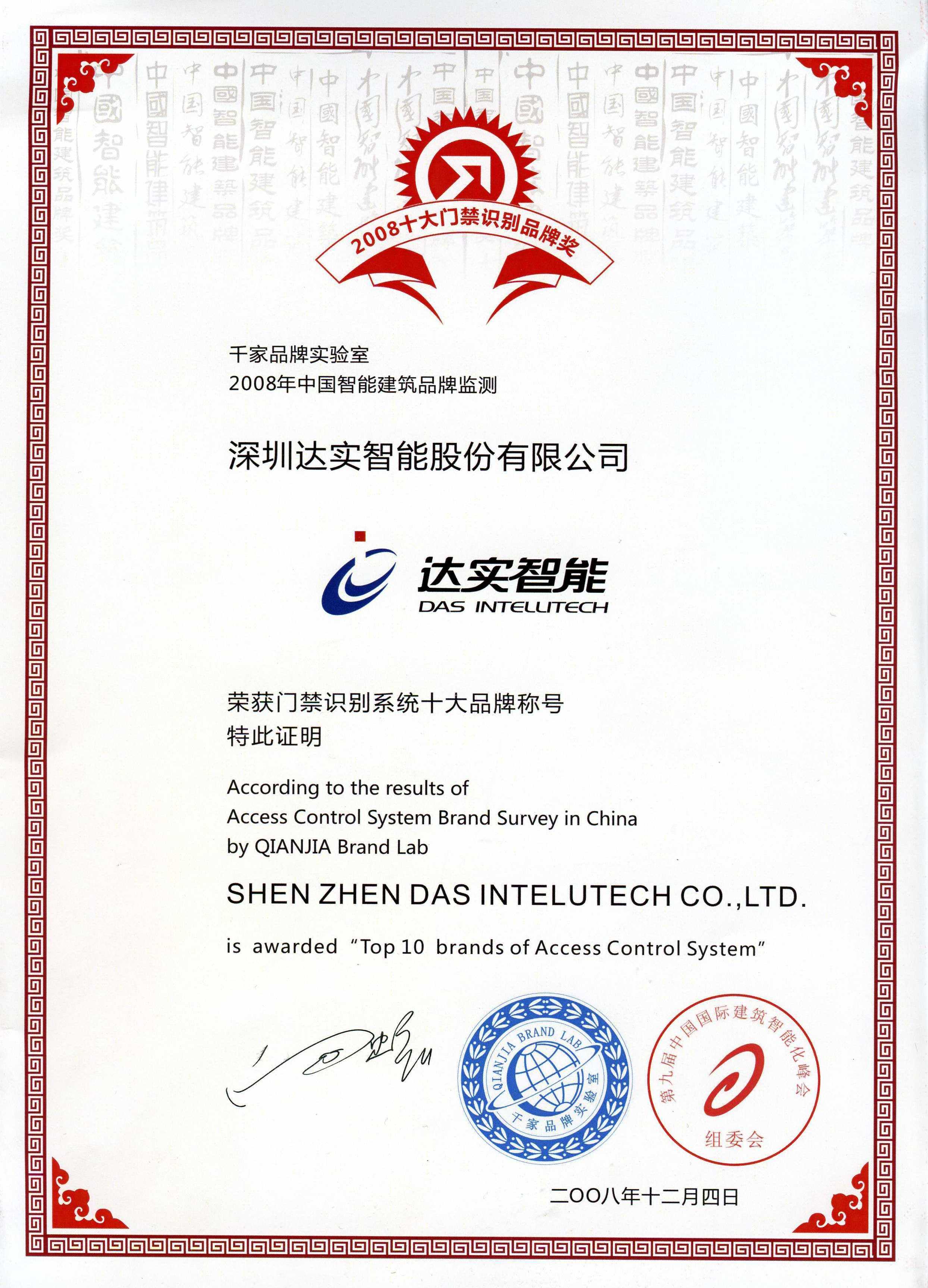 2008門禁識別十大品牌證書(千家)