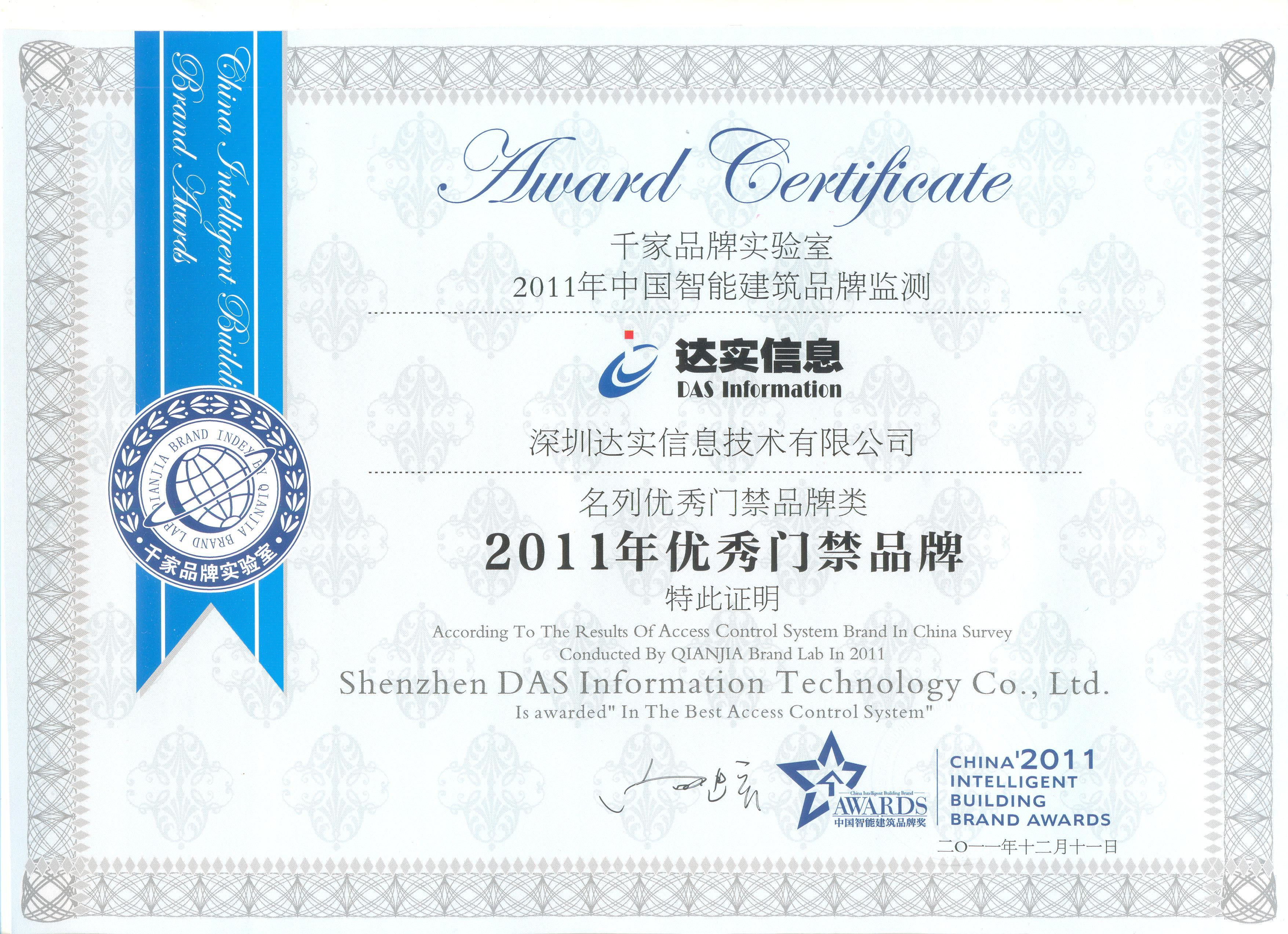 2011年中國智能建筑品牌獎(優(yōu)秀門禁)-千家網(wǎng)
