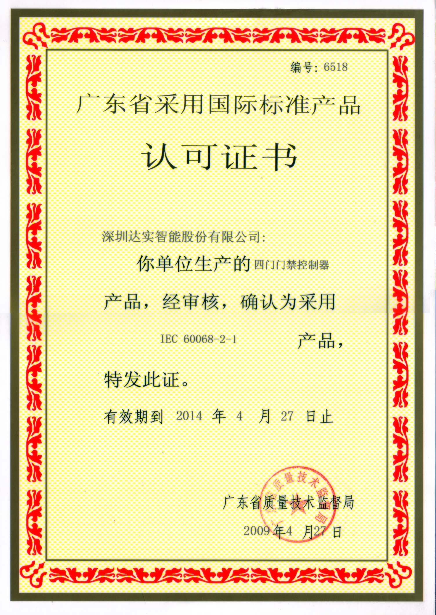 廣東省采用國際標準認可證書---四門門禁控制器