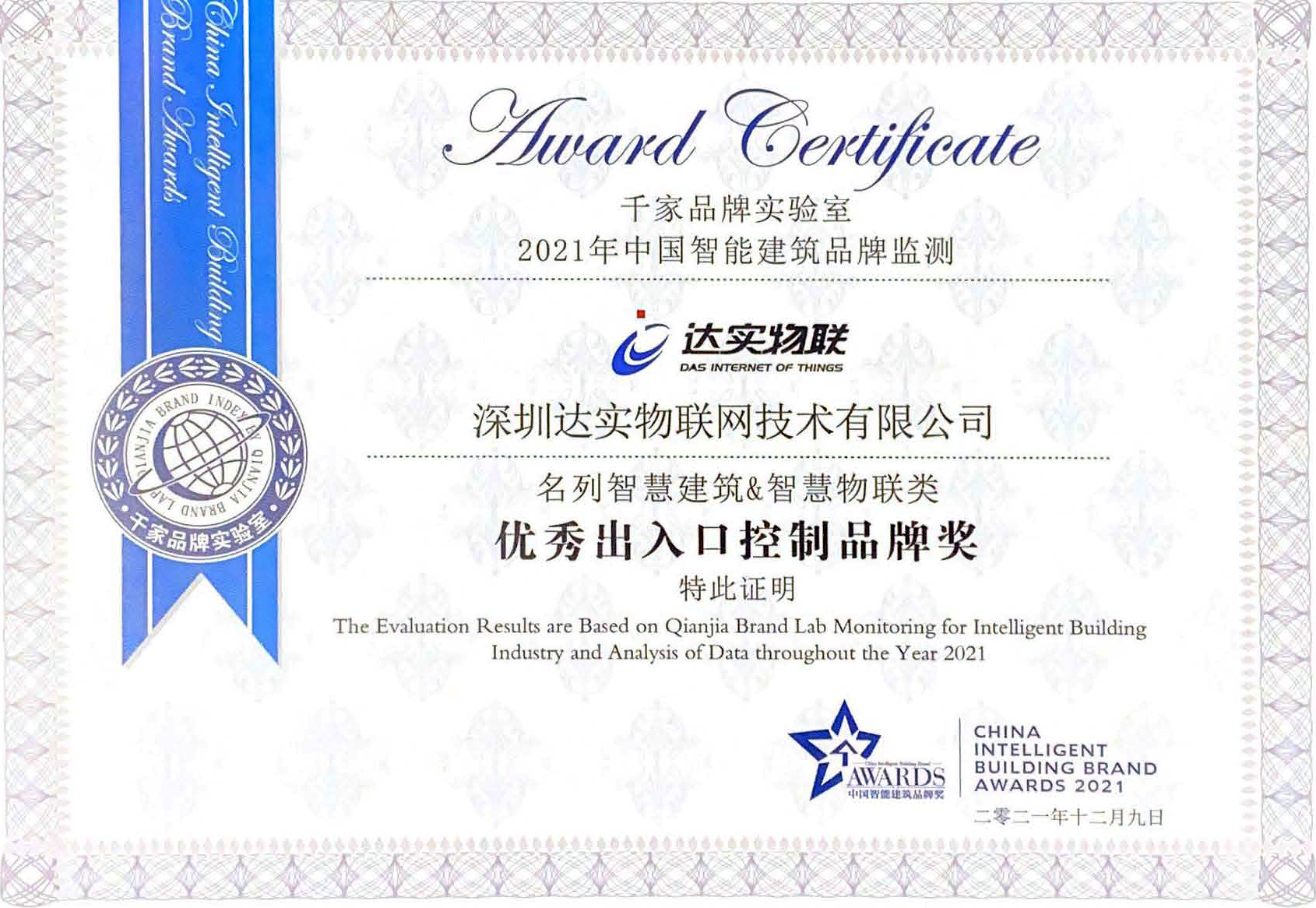 2021優(yōu)秀出入口控制品牌獎(千家網(wǎng))