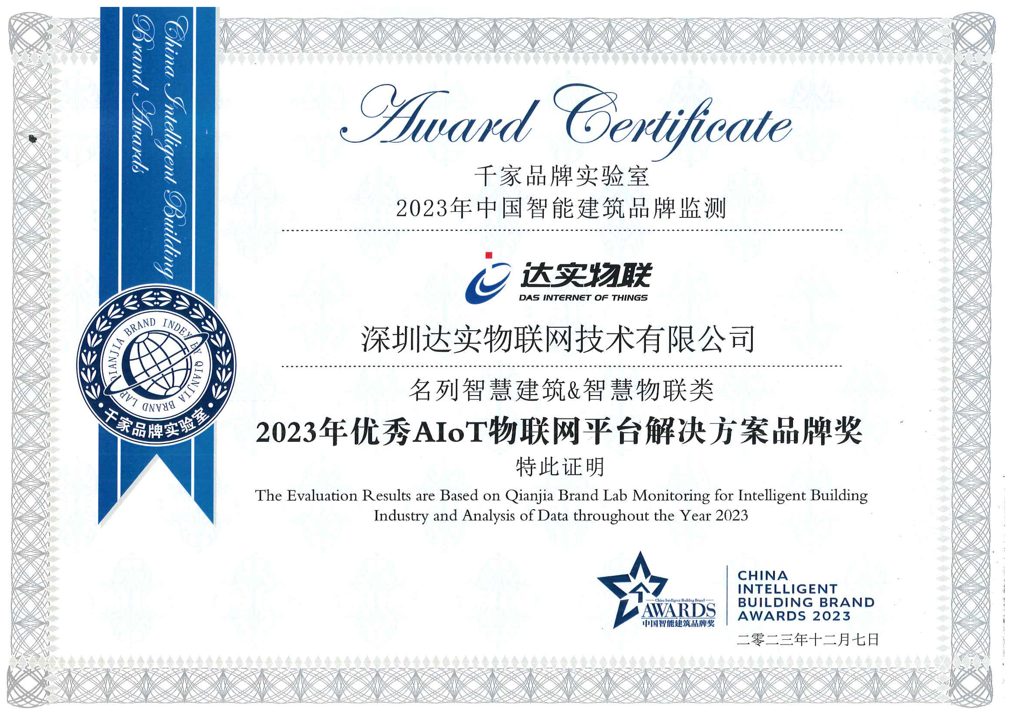 優(yōu)秀AIoT物聯(lián)網(wǎng)平臺解決方案品牌獎-千家
