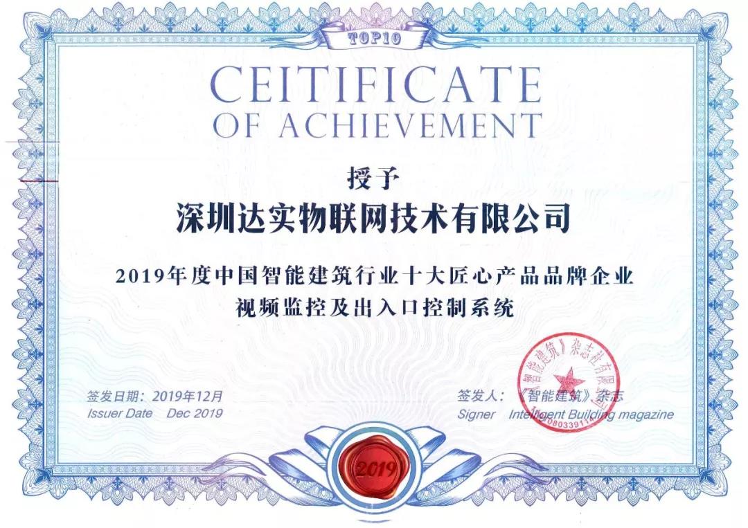 2019年度中國智能建筑行業(yè)匠心產(chǎn)品品牌企業(yè)-視頻監(jiān)控及出入口控制