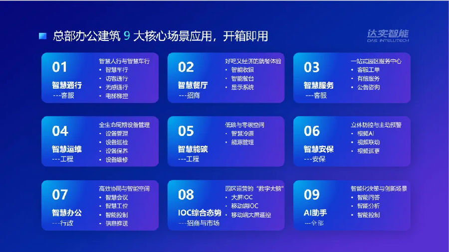 張琳介紹,達(dá)實(shí)擁有自主研發(fā)的物聯(lián)網(wǎng)核心解決方案產(chǎn)品,形成了1個(gè)平臺(tái)+8大系統(tǒng)的完整產(chǎn)品體系,包括位于行業(yè)第一梯隊(duì)的AIoT平臺(tái),媲美互聯(lián)網(wǎng)大廠的先進(jìn)三層分離技術(shù)架構(gòu),結(jié)合總部辦公智能化解決方案的九大場(chǎng)景,助力更多產(chǎn)城融合項(xiàng)目和總部辦公建筑完成建筑資產(chǎn)的數(shù)字化轉(zhuǎn)型升級(jí),并助力各產(chǎn)業(yè)園區(qū)實(shí)現(xiàn)節(jié)能、精減人力的降本增效,甚至助力產(chǎn)業(yè)園區(qū)的品牌展示和招商租賃,助力產(chǎn)業(yè)園區(qū)在激烈競(jìng)爭(zhēng)環(huán)境中取得商業(yè)成功。