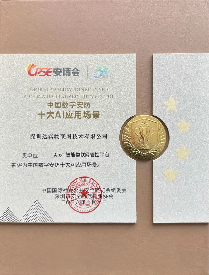 頒獎(jiǎng)盛典上,深圳達(dá)實(shí)物聯(lián)網(wǎng)技術(shù)有限公司憑借AIoT智能物聯(lián)網(wǎng)管控平臺的創(chuàng)新升級與落地應(yīng)用成果,一舉摘得“中國數(shù)字安防十大 AI 應(yīng)用場景”大獎(jiǎng);達(dá)實(shí)物聯(lián)總經(jīng)理張琳榮獲“中國數(shù)字安防時(shí)代風(fēng)云人物”獎(jiǎng)。