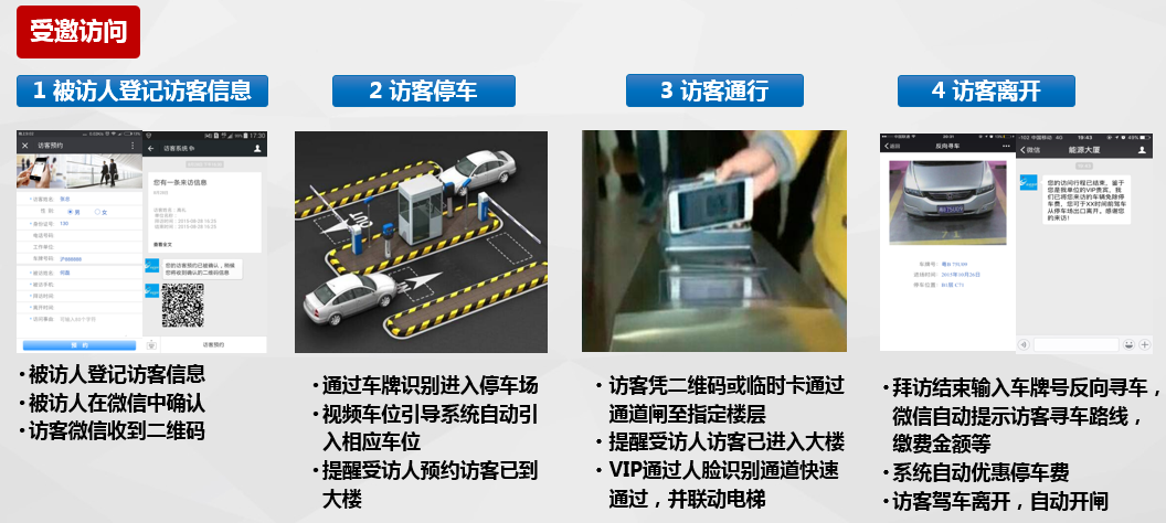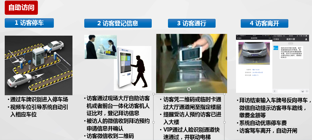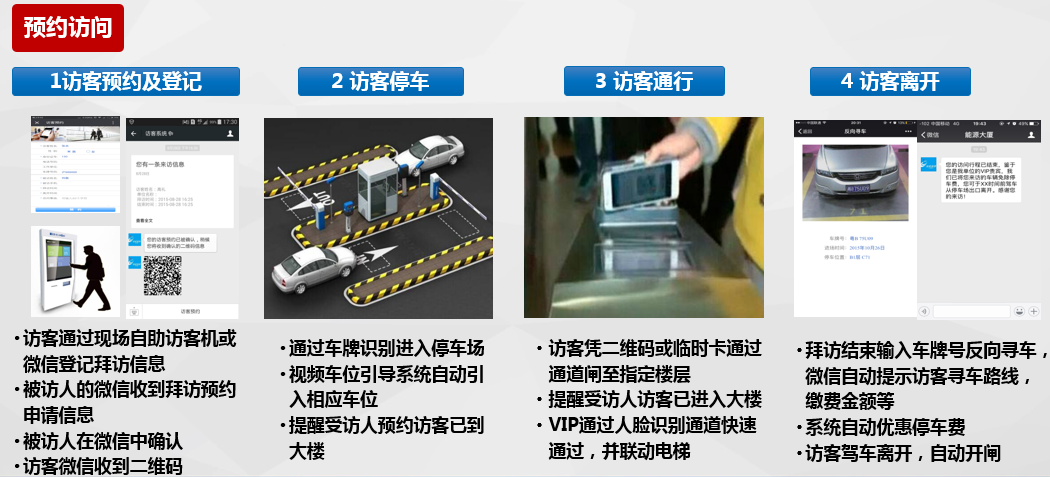 智慧訪客管理系統(tǒng)主要由訪客管理系統(tǒng)、微信一卡通平臺(tái)、APP一卡通平臺(tái)等組成,且與通道、梯控、門禁、停車場(chǎng)等系統(tǒng)無(wú)縫對(duì)接。