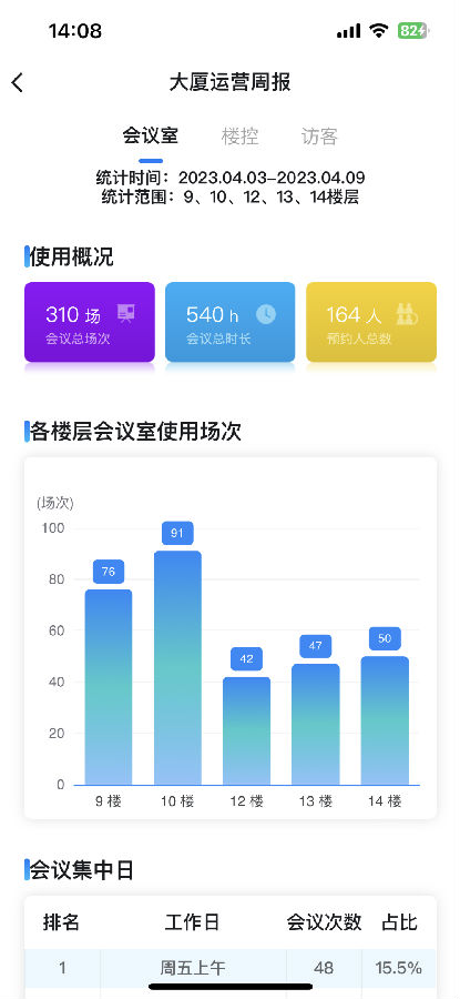 參會(huì)次數(shù)、樓控次數(shù)、訪客記錄、門禁記錄等大數(shù)據(jù)統(tǒng)計(jì)分析,為管理者決策提供可靠依據(jù)。