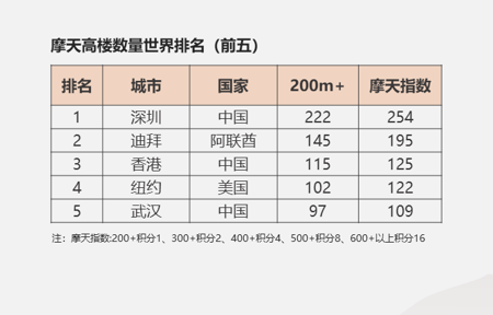 對(duì)現(xiàn)代化城市的衡量,其中有一個(gè)指數(shù)叫“摩天指數(shù)”(摩天大廈的指數(shù)),它衡量城市的計(jì)算方法,就是看有多少棟200m以上的建筑,有一棟加一分,300m以上的加2分,400m以上的加4分,500m以上的加8分,600m以上的加16分,合起來(lái)得到一個(gè)摩天指數(shù),標(biāo)志著這個(gè)企業(yè)現(xiàn)代化城市建設(shè)的發(fā)展水平