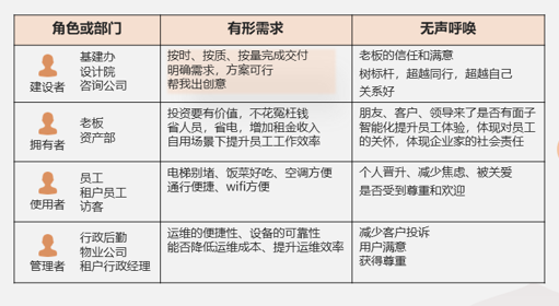 通常我們講“以客戶為中心,看客戶的需求”,我們通常只看第一行、第一列的客戶需求。第一行是采購(gòu)產(chǎn)品和服務(wù)的部門(mén)需求,第一列是他有形的需求。但我們不應(yīng)該只看到這個(gè)大樓智能化采購(gòu)者的有形需求,還要看到他們的無(wú)形需求,還要看到樓里邊的物業(yè)管理、辦公人員,甚至是訪客的有形需求和無(wú)形需求。有了這個(gè),再加上對(duì)客戶的深度、廣泛洞察,我們自然就能創(chuàng)新出解決方案。