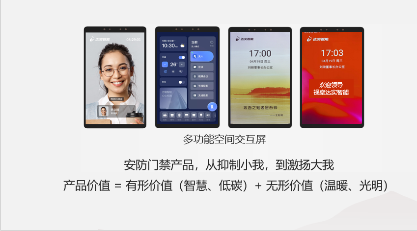 如何實(shí)現(xiàn)溫暖?這是一個(gè)屏幕,通常叫做安防產(chǎn)品,刷臉開(kāi)門(mén),安全防范。圣賢思想告訴我們,不僅要抑制人的小我,更要激揚(yáng)人心中的大我,所以這個(gè)不應(yīng)該是安防產(chǎn)品,它不僅要控制黑名單上的人不能進(jìn)來(lái),更應(yīng)該是歡迎尊貴的客人。由此創(chuàng)新硬件、軟件產(chǎn)品,把整個(gè)空間和人互聯(lián)互通,體現(xiàn)溫暖。