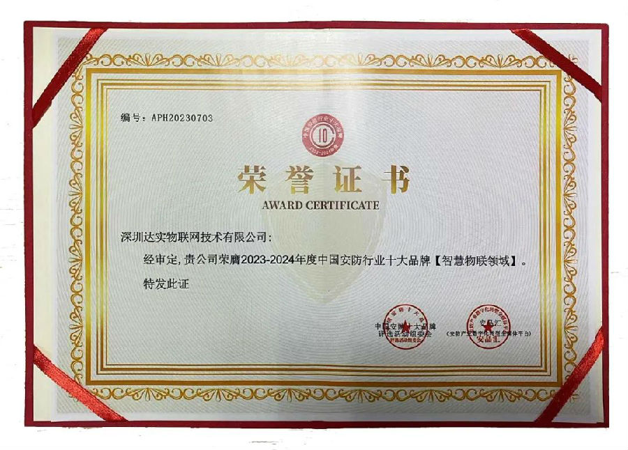 該獎項(xiàng)旨在進(jìn)一步推動我國安防行業(yè)的健康發(fā)展,提高我國安防品牌的知名度和影響力,展示我國安防企業(yè)的實(shí)力和成就,激發(fā)安防行業(yè)的創(chuàng)新活力,深圳達(dá)實(shí)物聯(lián)網(wǎng)技術(shù)有限公司于會上一舉奪得“2023-2024年度中國安防行業(yè)十大品牌(智慧物聯(lián)領(lǐng)域)”大獎!
