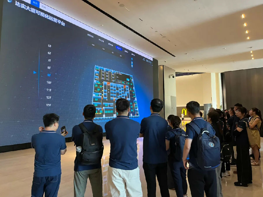 嘉賓一行首先參觀了達(dá)實(shí)大廈一層的運(yùn)營指揮中心,現(xiàn)場(chǎng)體驗(yàn)達(dá)實(shí)AIoT智能物聯(lián)網(wǎng)管控平臺(tái)。在參觀中,同學(xué)們了解到:達(dá)實(shí)大廈是達(dá)實(shí)自主投資建設(shè)的總部大樓,投資11億,大廈全面應(yīng)用自主研發(fā)的 AIoT 智能物聯(lián)網(wǎng)管控平臺(tái)、空間應(yīng)用系統(tǒng)及產(chǎn)品,實(shí)現(xiàn)了降低建筑能耗25%、精簡物業(yè)管理崗位25%、提升出租收益25%,榮獲國際 LEED 綠色建筑頂級(jí)的鉑金級(jí)設(shè)計(jì)和運(yùn)營認(rèn)證,是深圳首棟碳中和超高層建筑,也是 2023 年第 28 屆聯(lián)合國氣候變化大會(huì)十佳交流案例之一。