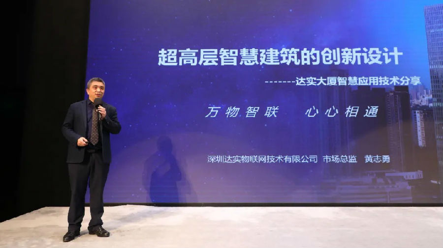會(huì)議進(jìn)入主題分享環(huán)節(jié)。深圳達(dá)實(shí)物聯(lián)網(wǎng)技術(shù)有限公司市場(chǎng)總監(jiān)黃志勇帶來(lái)主題為《達(dá)實(shí)大廈智慧應(yīng)用技術(shù)分享》的演講,重點(diǎn)結(jié)合達(dá)實(shí)大廈的創(chuàng)新技術(shù)成果與超高層智慧建筑的創(chuàng)新設(shè)計(jì),向參會(huì)嘉賓進(jìn)行了詳細(xì)介紹。