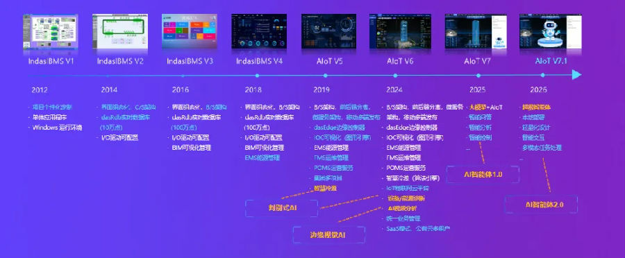 達(dá)實智能早在2012年開始了物聯(lián)網(wǎng)平臺的研發(fā),從2019年開始,達(dá)實智能將AI技術(shù)嵌入物聯(lián)網(wǎng)平臺,通過平臺使AI具備對物理世界的感知與執(zhí)行能力。平臺V5版本基于判別式AI打造智慧冷源應(yīng)用,V6版本實現(xiàn)了設(shè)備及能源診斷和AI視覺分析功能。去年發(fā)布的V7版本首次接入大模型,誕生了基于生成式AI的智能體,今年V7.1版本迎來AI智能體2.0升級版本,為智慧園區(qū)打造了專屬的超級智能體。